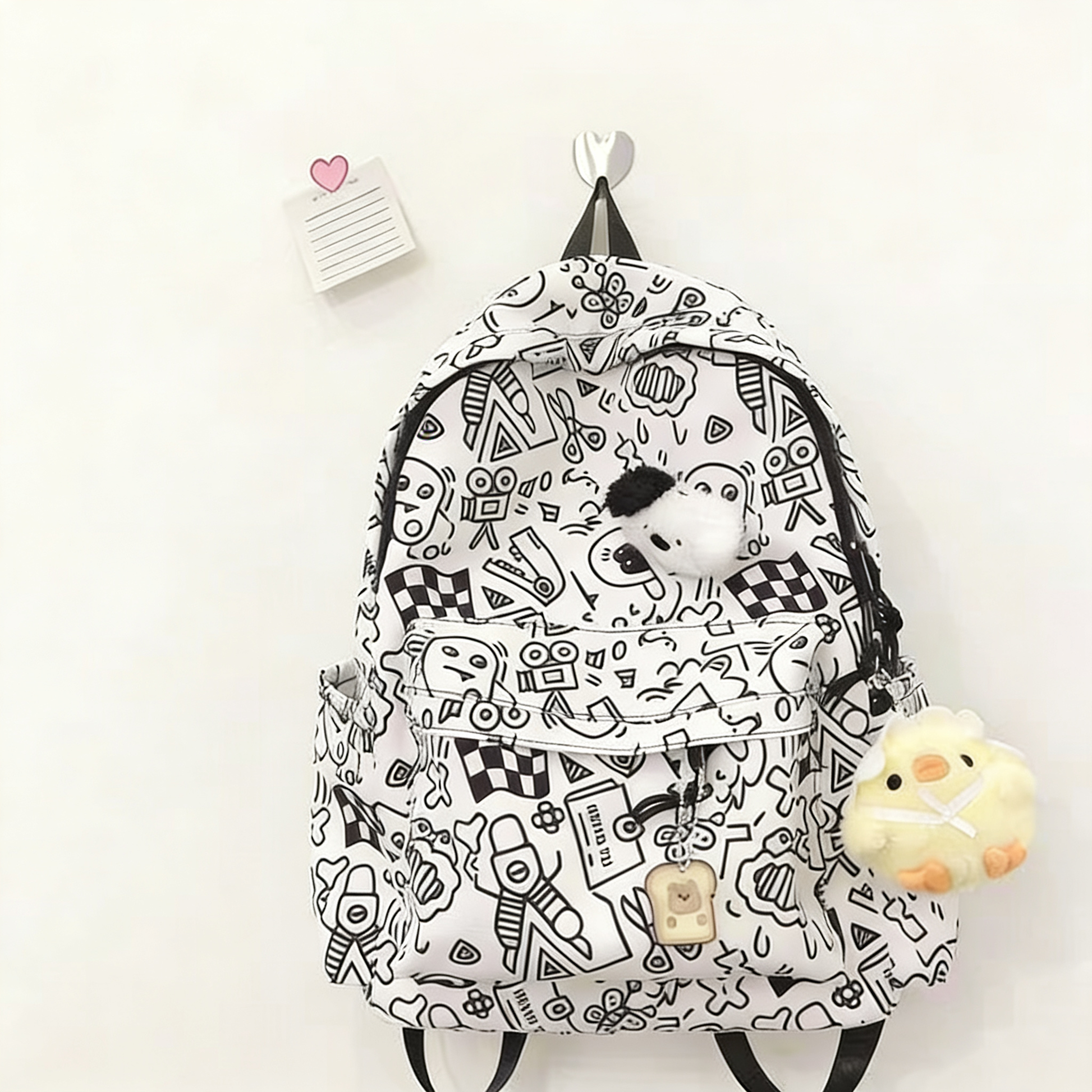 Thiết kế graffiti đen trắng, cảm giác đường phố tràn ngập: lấy trắng tinh khiết làm nền, phối hợp với đồ án graffiti đen trắng, dung hợp đường nét hình học, nguyên tố hoạt hình thú vị, phong cách cá tính rõ ràng không đụng chạm, dễ dàng tạo ra hiệu quả ăn mặc vừa có cảm giác đường phố vừa có phong cách học viện, là sản phẩm đơn giản thể hiện thẩm mỹ hấp dẫn độc đáo.